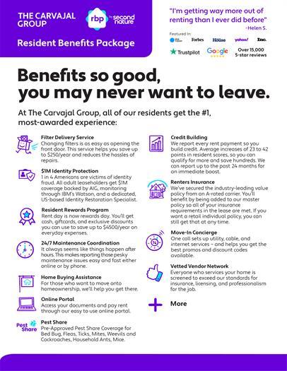 All Carvajal Group residents are enrolled in the Resident Benefits Package (RBP) for $65/month which includes renters insurance, credit building to help boost your credit score with timely rent payments, $1M Identity Protection, HVAC air filter delivery (for applicable properties), move-in concierge service making utility connection and home service setup a breeze during your move-in, our best-in-class resident rewards program, Pest Share, an innovative pest control service that provides an effective, on-demand, and targeted reactive approach to pest control and much more! More details upon application.